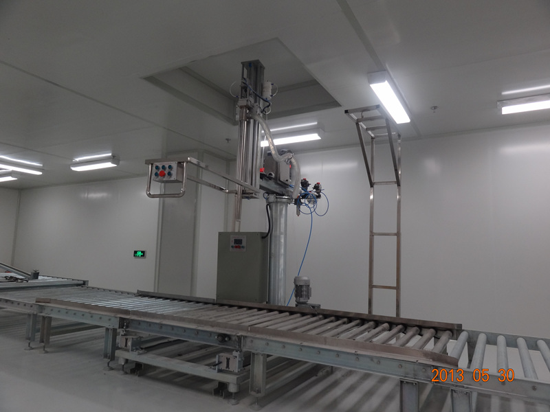 该设备采用单头四工位半自动形式(吨包装是单头单工位),需人工旋转和推位操作臂寻口定位,灌装与称重为自动完成,之后由人工用气动工具将桶盖旋紧并夹好防伪盖。称重系统采用精度传感器和称重仪表,具有落差自动修正和零点自动跟踪等多项功能(详见称重仪表说明),可根据用户需要选择净重或毛重方式灌装,灌装系统采用粗、精灌装方式,以确保灌装精度和速度,可实现自动和手动控制灌装动作,快捷更加方便、直观。