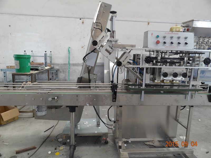 该机外形美观大方、灵巧、旋盖速度快,合格率高、可适用于食品、制药、日化、农药、化妆品等行业的不同瓶形的旋盖。四台调速电机分别用于供盖、夹瓶、传送、旋盖,机器自动化程度高,稳定性好,调节方便,更换瓶形或盖时无须备件,只需作调整即可完成(如配上料机,可进行自动将盖子送到振动盘里面)。