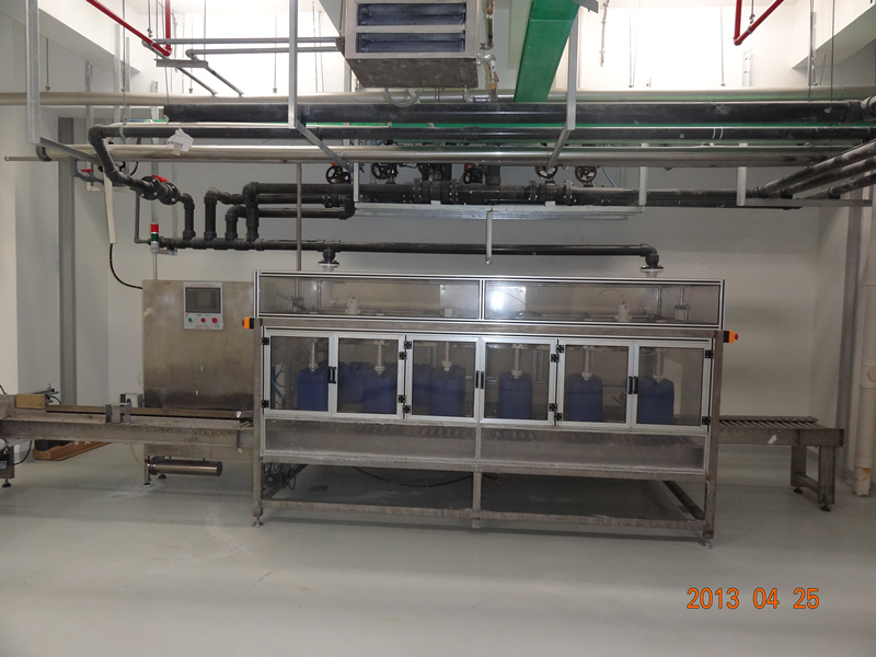 手工放桶—自动输送—6头自动定位称重灌装—自动理盖—自动旋盖—重量检测—自动贴标—自动喷码—输送到码垛位—半自动码垛—托盘输送—叉车运走