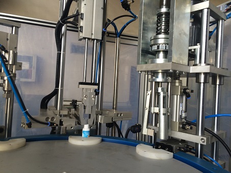 有输送机将瓶子转入灌装位,自动灌装,灌装后再自动进入旋盖,当瓶子转到自动旋盖过程中,瓶盖有机械手夹子夹住瓶盖,将瓶盖送入瓶口上,旋盖头自动旋盖、贴标、脱瓶等动作,是在该机的凸轮导轨的控制下完成的。